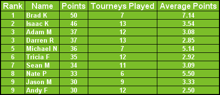 Tournament at Brian's was won by Brad K. This is Brad's 3rd win in a row (when he's attended a tournament). Points have been updated. Isaac now tops the leader board. Only 2.5 months until the year is over. Remember, the top 9 players get to play in the championship tournament for free. Others will be allowed to enter also. More details are yet to come. |